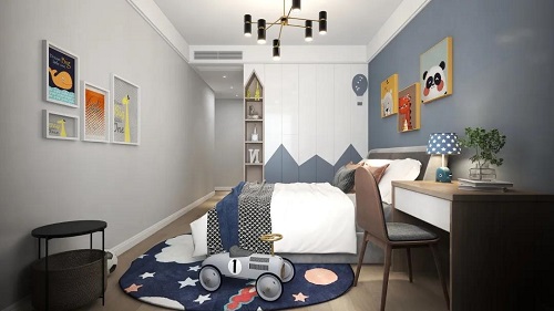 兒童房藍(lán)白相間的柜門,搭配在原木系的柜體上,清新脫俗,沒有任何的壓抑感,讓孩子盡享生活的美好。